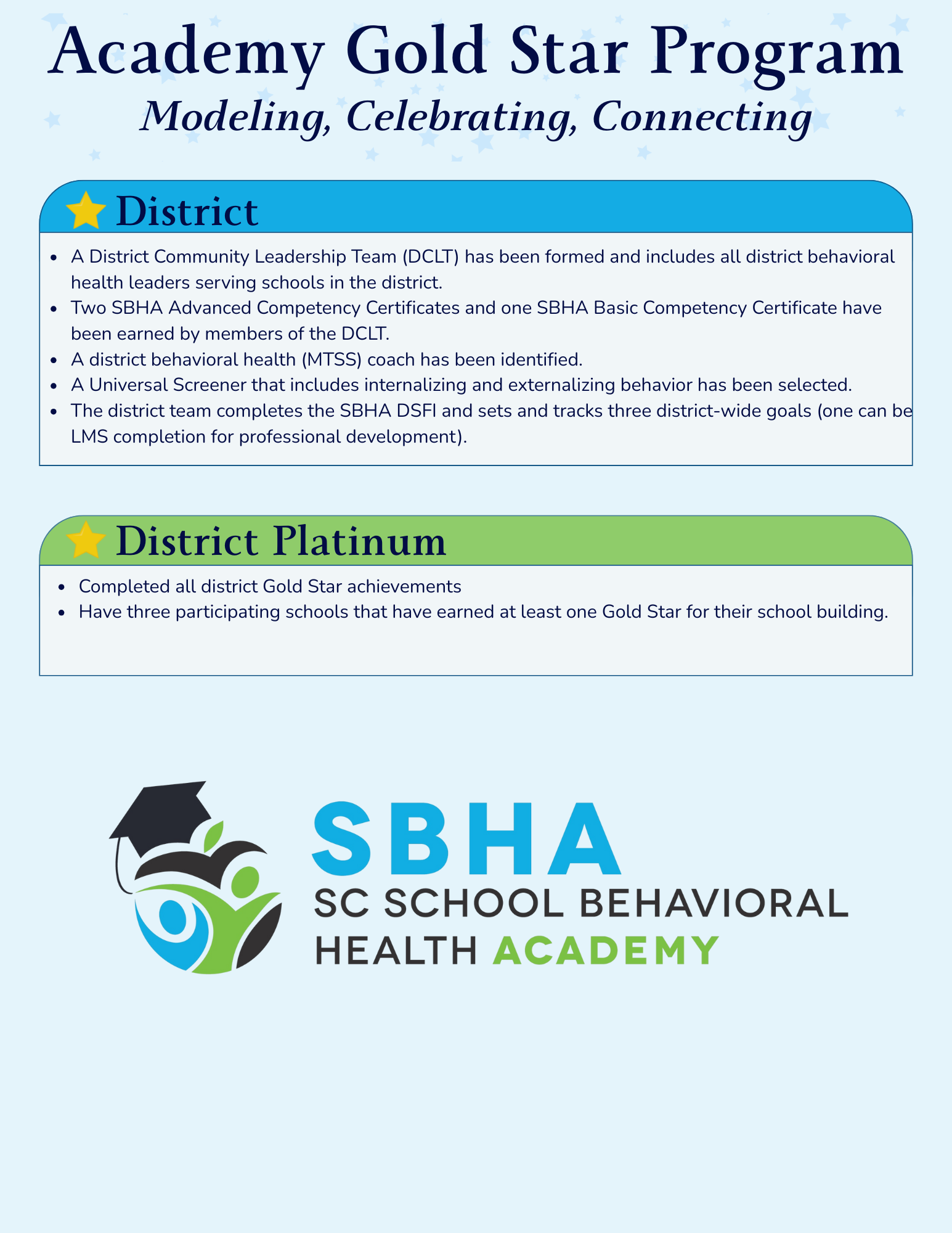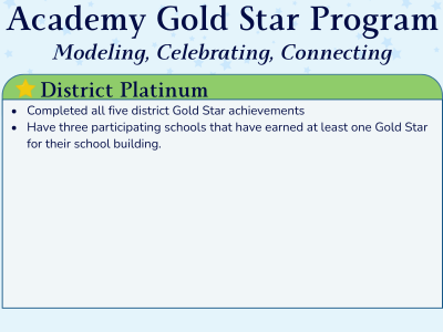 Districts earn Gold Star Achievement recognition by meeting all district-level benchmarks. A prestigious Platinum Star is awarded to districts that meet all benchmarks and have at least one elementary, one middle, and one high school with Gold Star recognition.
