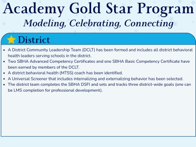 Gold Star recipients will be honored at the annual Southeast School Behavioral Health Conference, featured in our SBHA newsletters, and highlighted across our social media platforms.
